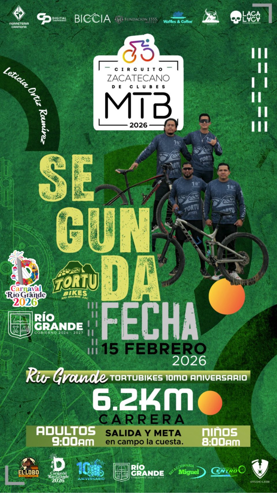 Fecha 2 – Circuito Zacatecano de Clubes MTB – 2026 Fecha 2 – Circuito Zacatecano de Clubes MTB – 2026 00 días 00 horas 00 minutos 00 segundos Fecha Feb 15 2026 Hora 8:00 am - 2:00 pm Localización Rio Grande, Zac Rio Grande, Zac Categoría MTB Organizador Circuito Zacatecano de Clubes MTB Web https://www.facebook.com/Circuito-Zacatecano-de-Clubes-MTB-401729333267784/ Compartir este evento