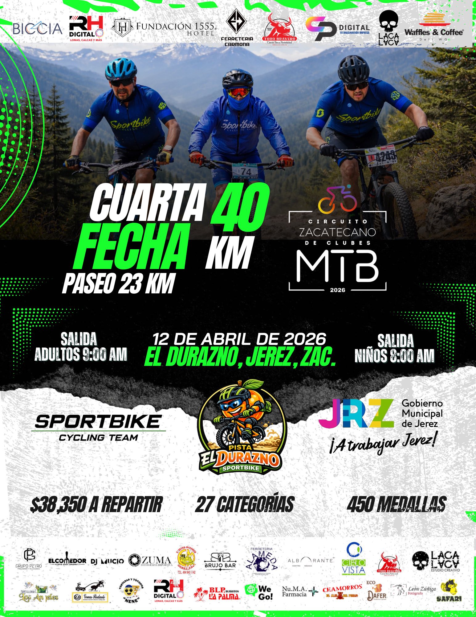 Fecha 4 – Circuito Zacatecano de Clubes MTB – 2026 Fecha 4 – Circuito Zacatecano de Clubes MTB – 2026 El evento está terminado. Fecha Abr 12 2026 Expired! Hora 8:00 am - 2:00 pm Más Información Resultados Localización Jerez Jerez, Zac Categoría MTB Organizador Circuito Zacatecano de Clubes MTB Web https://www.facebook.com/Circuito-Zacatecano-de-Clubes-MTB-401729333267784/ Resultados Compartir este evento